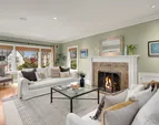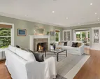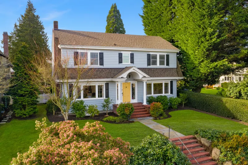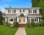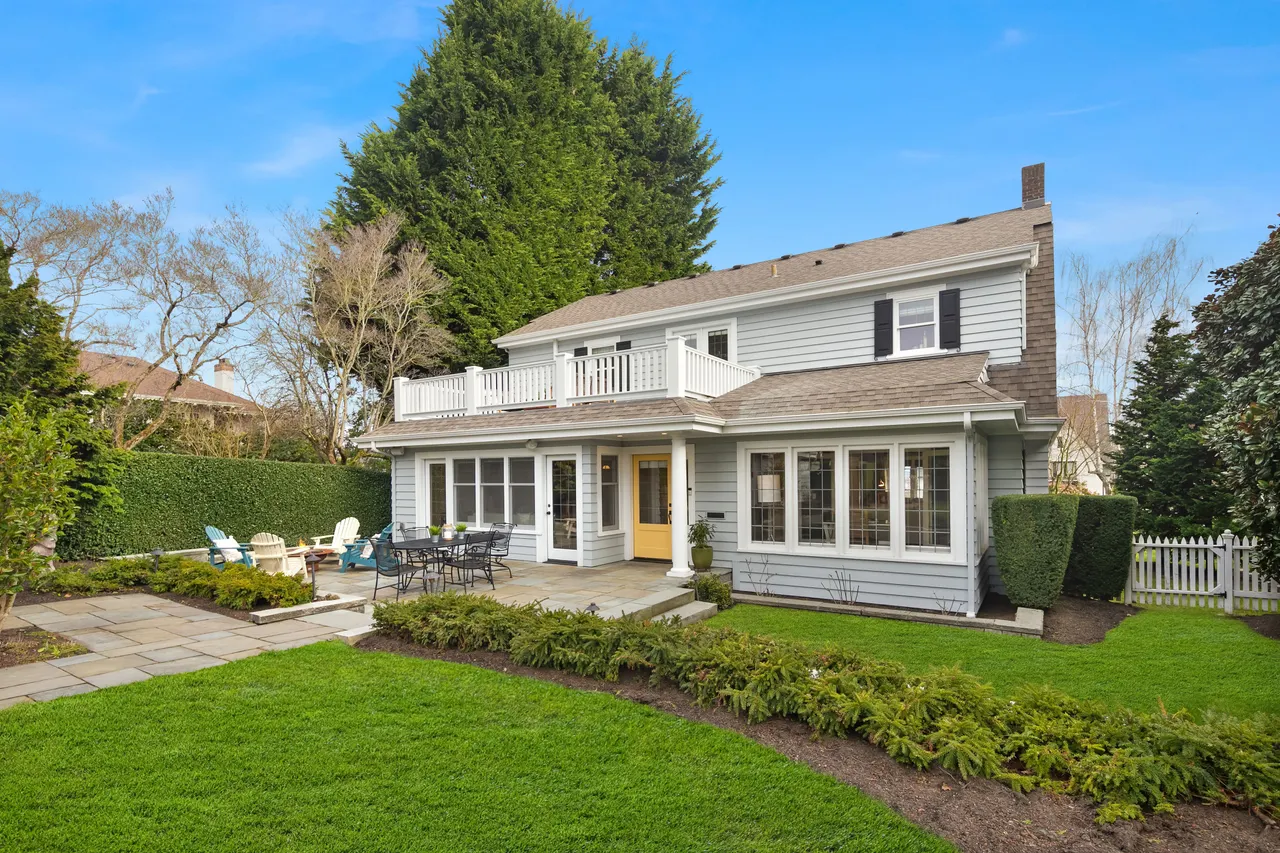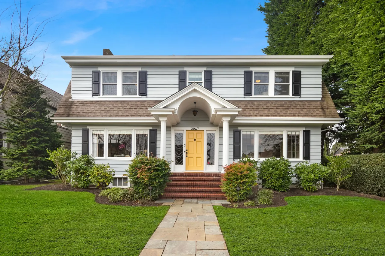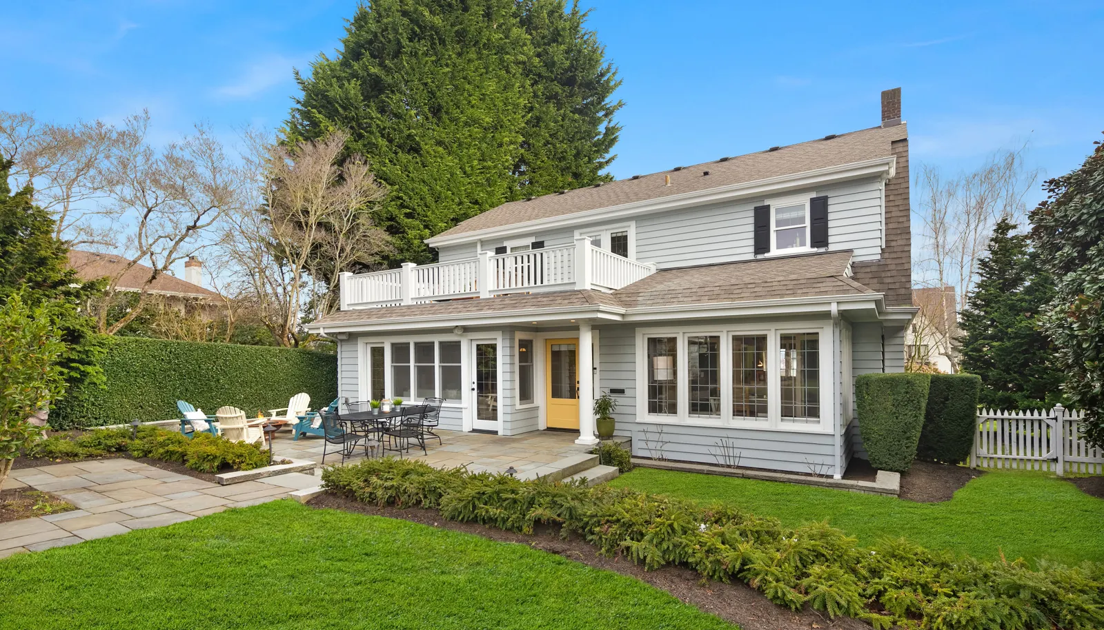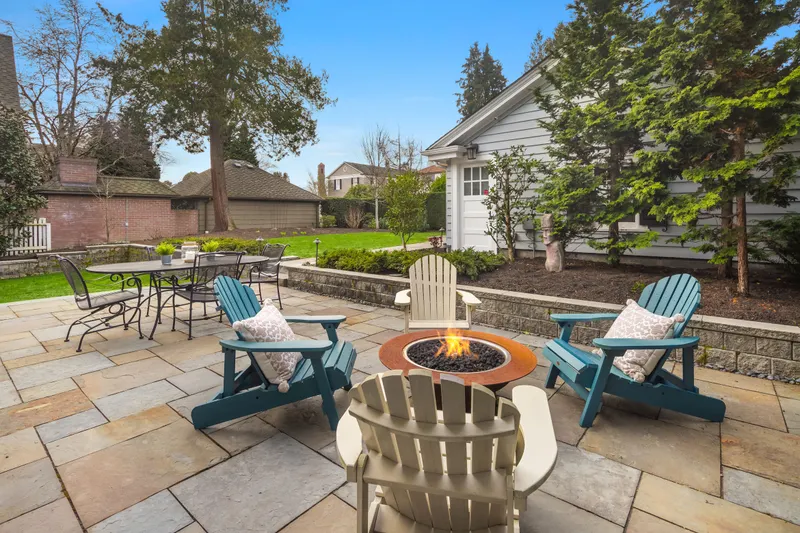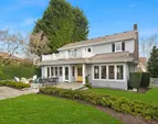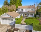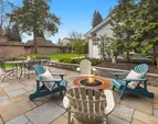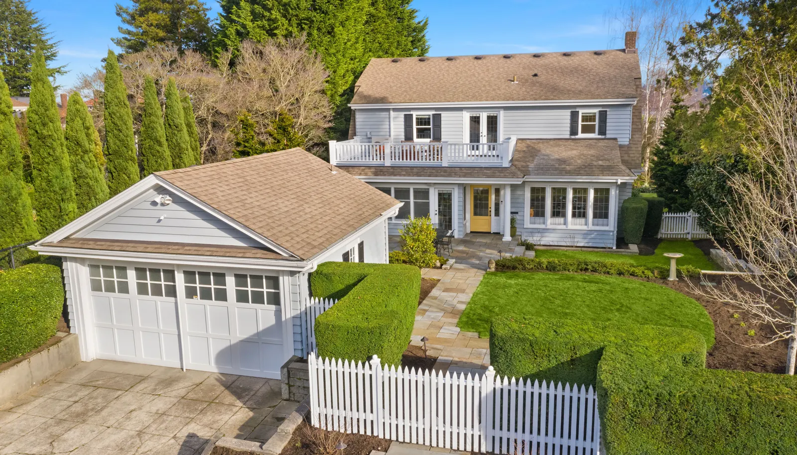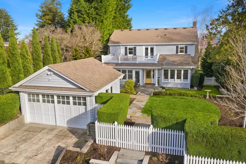 Three beds and two baths up include primary suite with walk-in closet plus luxe sauna. Downstairs holds media room, guest suite, gym plus storage. Short Pennsylvania Blue Stone path leads from the two-car garage detached garage to the mudroom off the family room.
