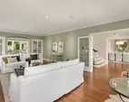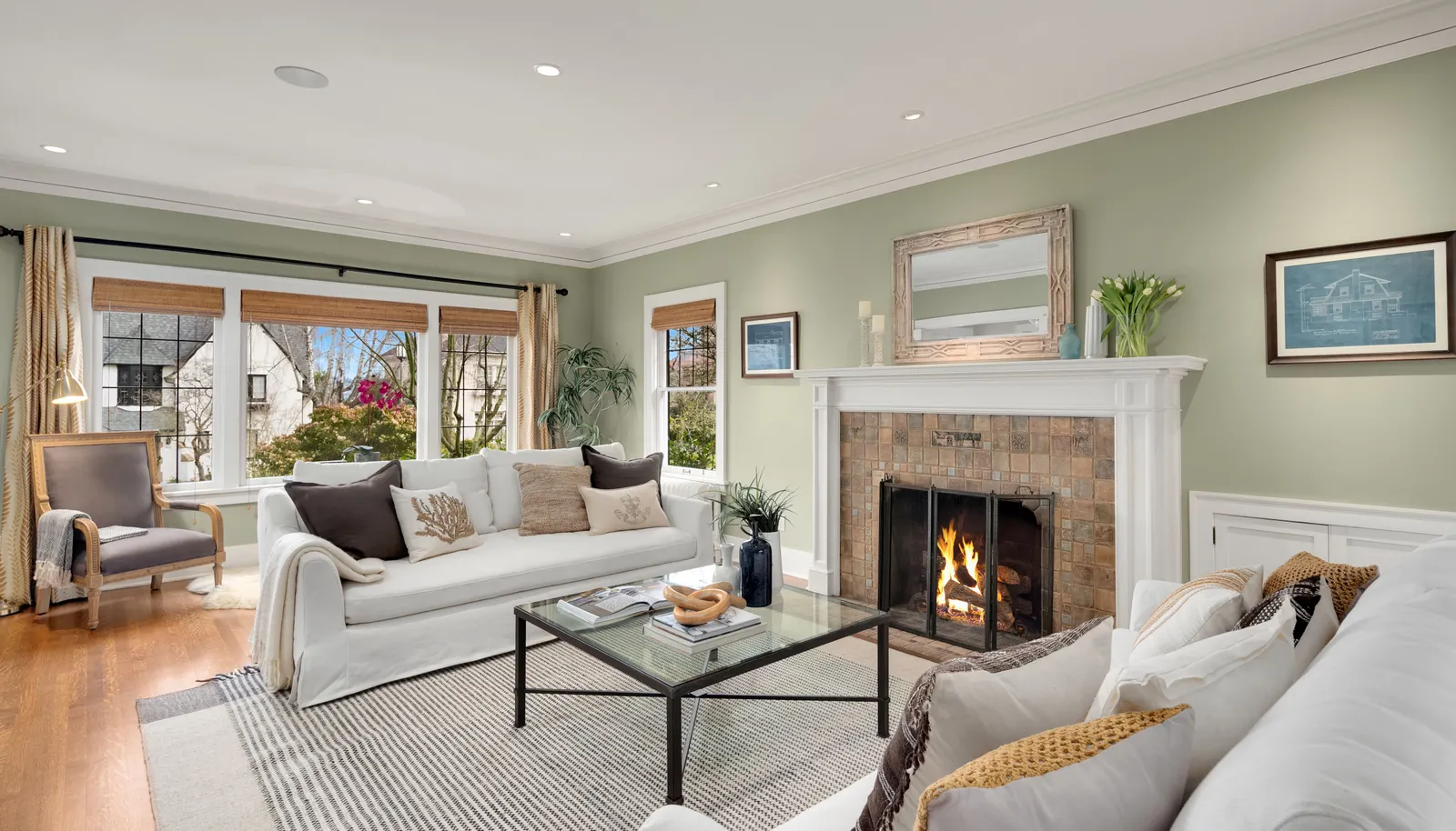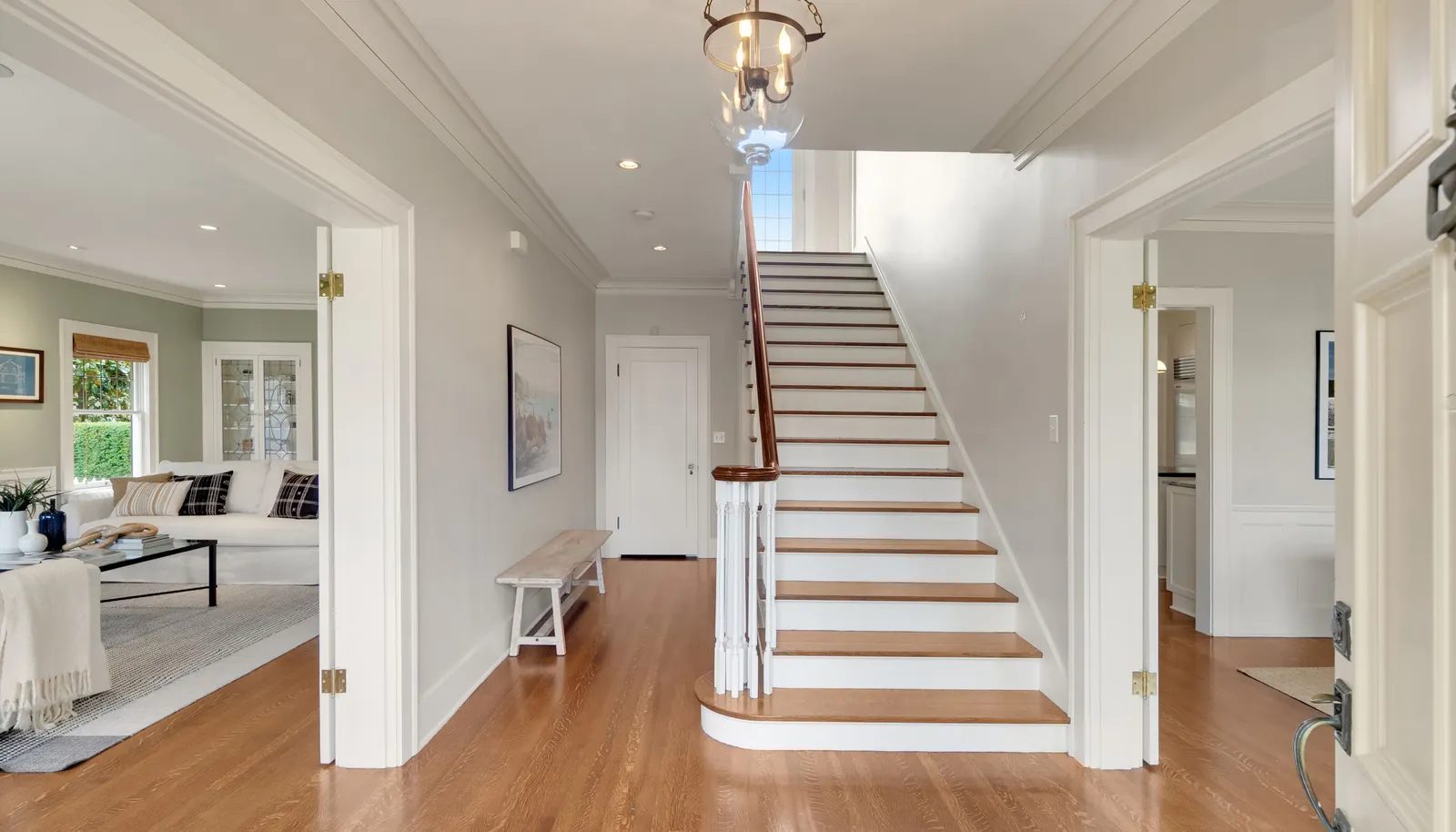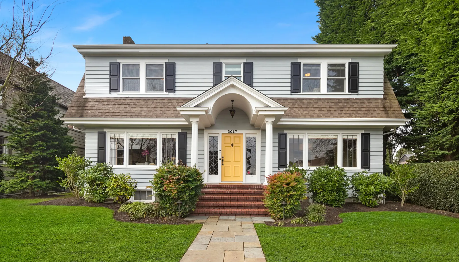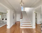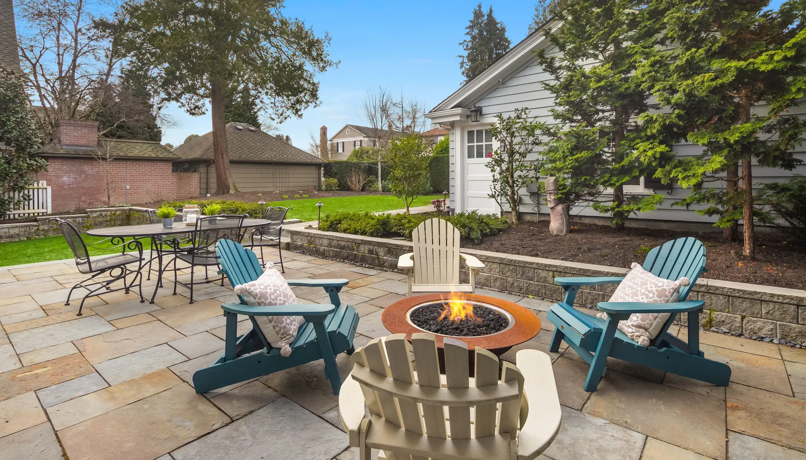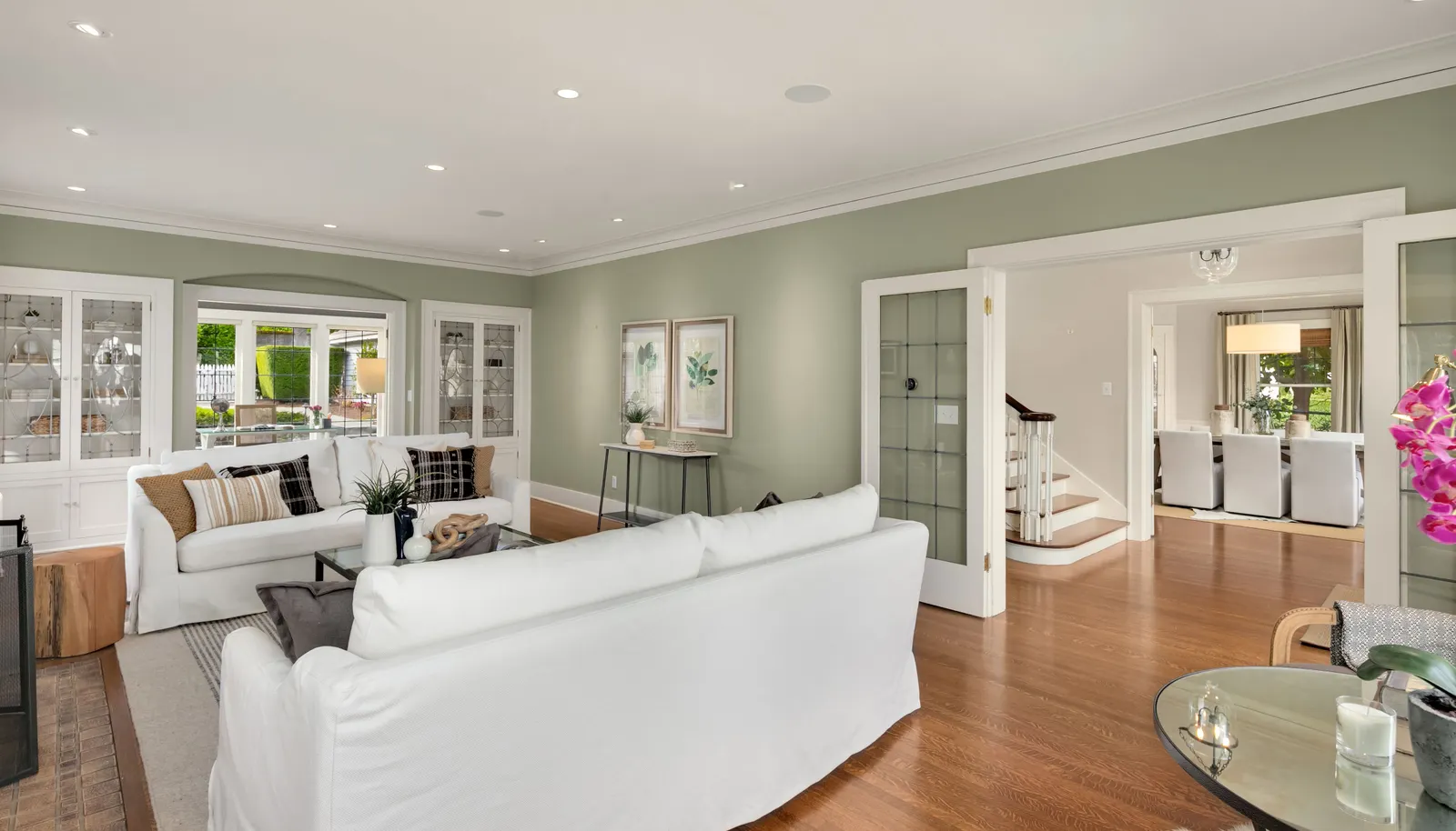 Three beds and two baths up include primary suite with walk-in closet plus luxe sauna. Downstairs holds media room, guest suite, gym plus storage. Short Pennsylvania Blue Stone path leads from the two-car garage detached garage to the mudroom off the family room.